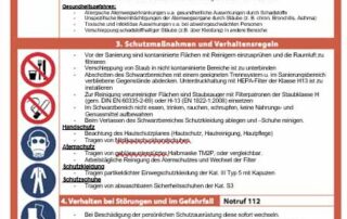Wir kümmern uns um Gefahren… Bei Wasserschäden kann es leicht zur Kontamination von Bauteilen oder Inventar kommen. Das kann Schimmelpilzbelastung, Schutzwasser oder sogar eine Belastung von Schadstoffen sein. Nur wenige wissen, dass in diesem Fall Betriebsanweisungen, als Hinweis für Gebäudenutzer,